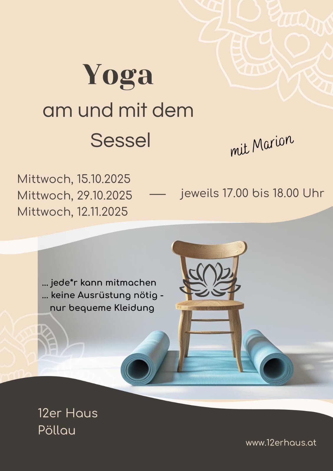 YOGA am Sessel Marion zeigt einfache Yoga und Dehnungsübungen am Sessel Onlineanmeldung Einfach Name eintragen und schon bist du für die Teilnahme am Event angemeldet (optional). Vorname und Nachname Datum 15 Okt. 2025 Uhrzeit 17:00 - 18:00